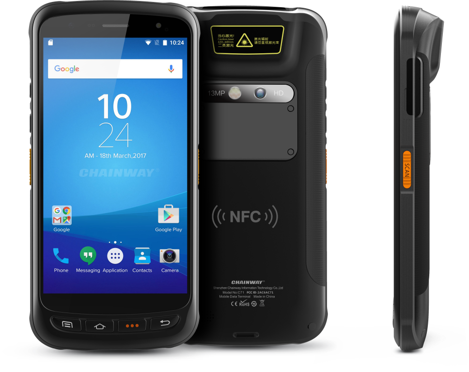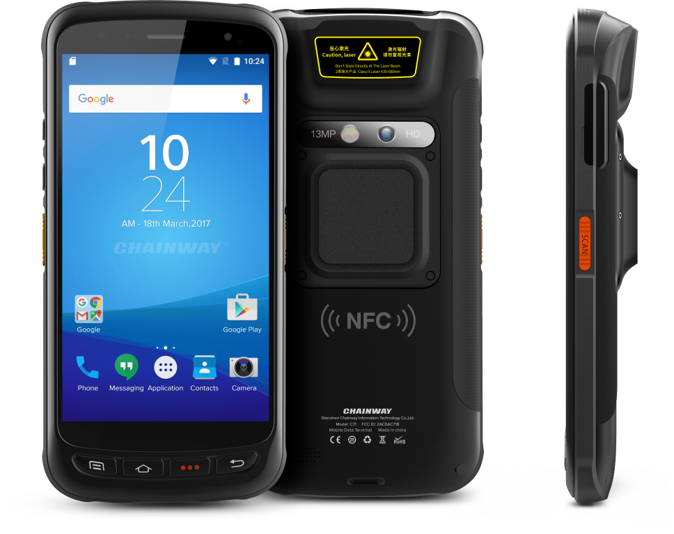 Chainway C71 is an industrial-grade rugged mobile computer with high extensibility. Built with Android 8.1 / 11 OS and Octa-Core processor, it supports abundant optional functions, including barcoding, NFC, HF, UHF, iris/fingerprint recognition, PSAM and camera, etc. The excellent performance makes C71 ideally deployed in logistics, retail, warehousing, healthcare, power, card, parking charge, government projects to help users quickly achieve informatization management and improve operational efficiency.